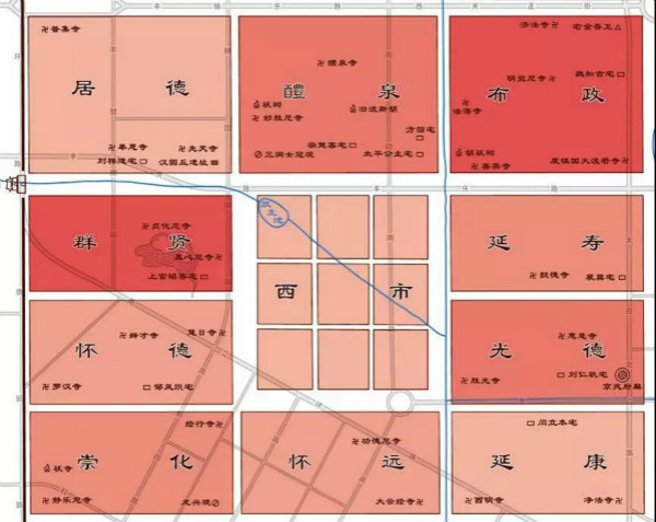 ▲ 西市模型图,今天的大唐西市大概包含了这个九宫格的中间格和东北的一部分