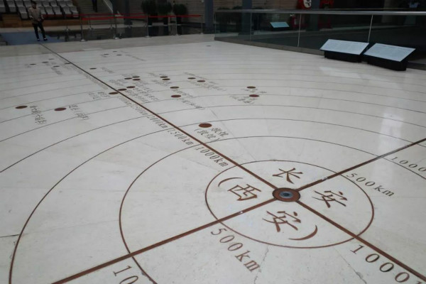 ▲ 大厅地面装饰,盛世大唐向周边辐射,远处的点是西域诸国的坐标