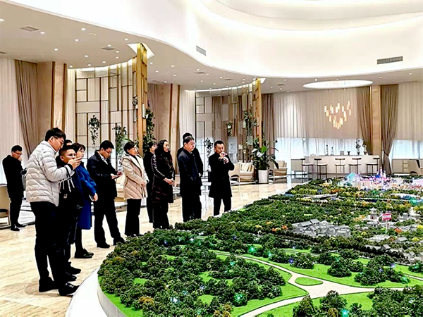 考察团一行参观了项目总体规划展厅、康百万丝路文化城北地块建设区及翡翠江景城江景城意境区、售楼部、样板房。