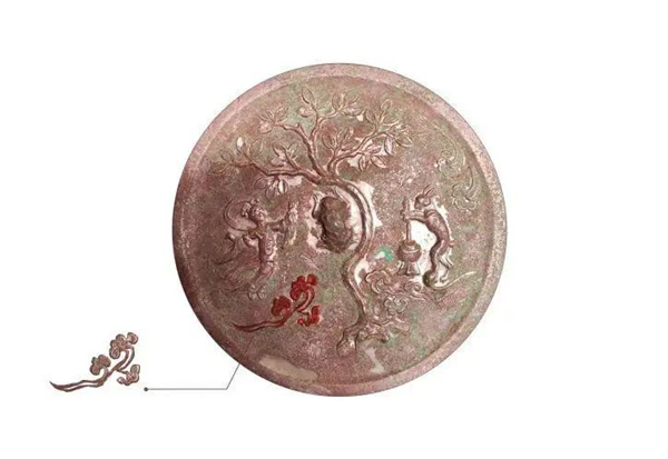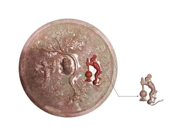 镜中央为一株枝叶茂盛,盘根错节的桂树,桂树是《山海经》中记载的神树,树干右侧绕过镜钮生长。镜钮为一只象征着财富的蟾蜍,右侧为一只灵动站立的玉兔,该兔双耳竖起,前肢执杵呈捣药状,左侧为翩翩欲飞的嫦娥,嫦娥头梳高髻,眉目清秀,双臂开张,衣袂飞扬,似升似腾,婉若惊鸿;树根周围及镜的边缘漂浮着朵朵祥云。整个画面动静相宜,和谐自然,生动美妙。