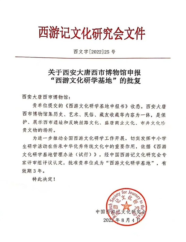 未来,大唐西市博物馆将不断丰富研学资源,创意开发新的研学课程,继续推动研学活动有序开展,在中国西游记文化研究会对基地工作的指导和支持下,努力促进丝绸之路与西游记文化沿线的历史文化传承,助力当代文化传播及城市建设和产业发展等有力融合,更好地传承和弘扬中华优秀文化。