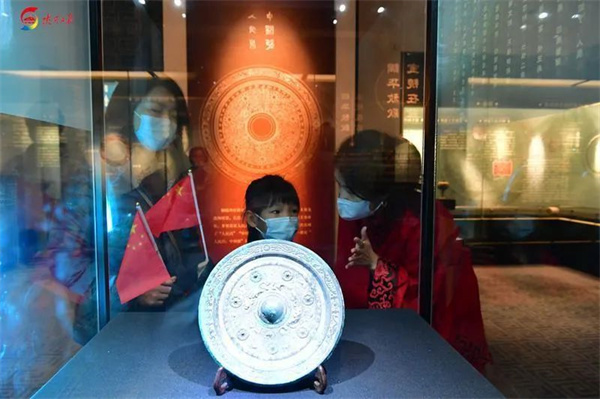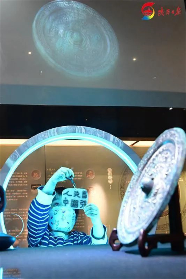 10月6日,西安大唐西市博物馆讲解员正在给一位小朋友讲解“人民昌·中国强”汉代铜镜的历史渊源。