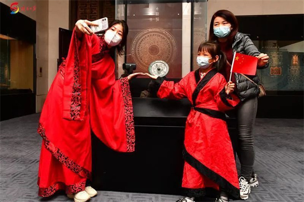 国庆节期间,大唐西市博物馆以铜镜文物元素为基础,将纹饰、铭文等重点提取,创意策划了“人民昌·中国强”汉镜活动热缩片现场手作、汉服体验等活动,并研发出系列文创产品,包括丝巾、手链、帆布包等配饰,文件袋、印章等文具,还有搭配汉服体验活动拍照打卡的仿古扇,创意口罩等,让观众了解文物上祥瑞神兽图案背后的故事,把“文物”带回家。