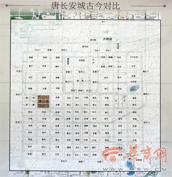 长安城有个中轴线,就是朱雀门大街。街东属万年县,街西属长安县,两个县的布局基本相同。两个市场,一个在皇城西南,属长安县,就是西市;一个在皇城东南,属万年县,就是东市。两个市场规模很大,各占两坊之地,是当时的超级批发市场。