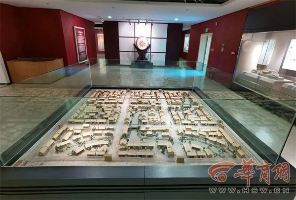 博物馆二楼基本陈列开端部分,有开市鼓、闭市钲,还有日本学者妹尾达彦根据文献资料记载绘制的大唐西市街景。画面上店铺众多,行商坐贾皆有,街道上车水马龙,驼队马匹络绎不绝。