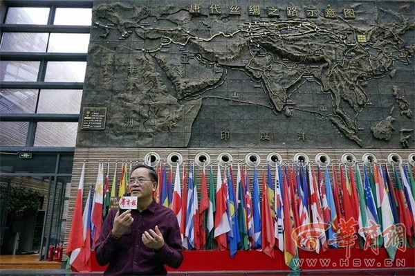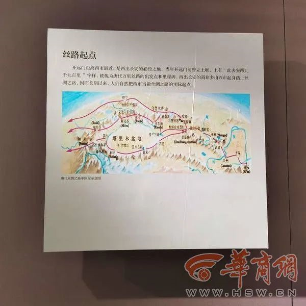 博物馆一楼大厅的墙上有巨幅的唐代丝绸之路示意图。王双怀教授讲,东西二市的商品来自于国内和国外。国内来自当时全国350个州1100多个县,国外主要是通过丝绸之路运到长安城、运到西市来的。丝绸之路不是一条路,而是中国古代连通亚、欧、非三洲的道路系统。它兴于汉而盛于唐,在历史上发挥了非常重要的作用。唐代时,丝绸之路系统就非常完备了,它分为陆上丝绸之路、海上丝绸之路两大系列。