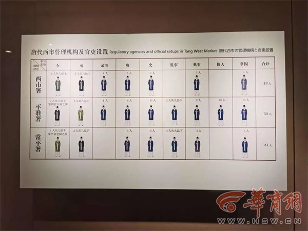 博物馆对唐代西市管理机构及官吏设置也做了图表展示。林喆介绍,唐代西市最重要的管理机构叫西市署,最高长官为西市令,官阶为从六品上。令之下还有丞,西市丞有两人,为正八品上。此外,还有录事、府、史、典事、掌固等办事人员,共18人。也就是说,18个人管理了一个占地约一平方公里的市场。而这个市场在最鼎盛时期,行商加坐商达4万余户。行商就是挑着扁担打地摊走街串巷的,坐商就是在店铺里面经营的。按照一家商户平均一至两个人来算,光是卖东西的商人最鼎盛时每天就有4万到8万人。长安城当时是世界上首个突破百万人口的城市,所以西市每日的人流量相当高。班固形容汉代的市场是“人不得顾,车不得旋”,而唐代比汉代的市场更繁荣。