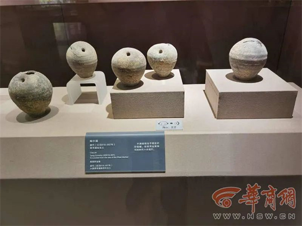 李春林研究员介绍,西市出土文物与工商业相关的很多,比如展柜中展陈的扑满,是用来存放铜钱的陶器,可以把铜钱从缝里塞进去,在西市发掘的五个区域都发现有这种东西。在西市遗址发现的铜钱有开元通宝、乾元重宝等。