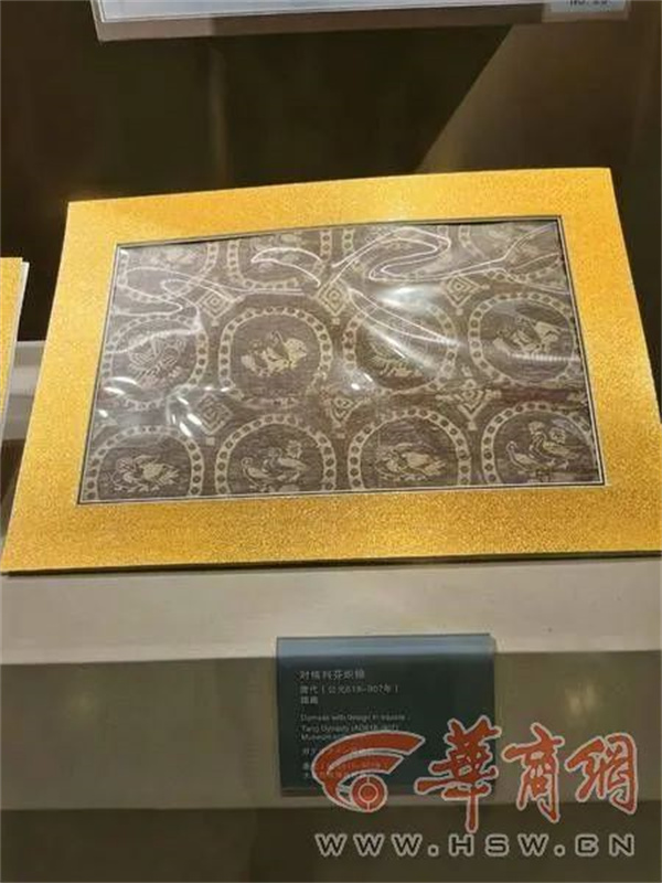 丝织品文物中,有一双唐代的靴子非常吸引人,有游客戏称唐朝人也穿雪地靴。比较珍贵的还有对格里芬织锦,丝绸上的纹饰能明显看出唐代的文化特性,而格里芬鹰首狮身的形象,则是来自于希腊和西亚传说中的神兽。其它丝织品文物中有麒麟、大象的形象,也富有外来文化元素。还有一件非常少见的丝绸,上面有三种纹饰:右侧是麒麟瑞兽的形象;中间是波斯拜火教(即祆教)的生命树造型;左侧是有歇山顶、鸱吻、带竖隔窗的唐朝传统建筑图案。