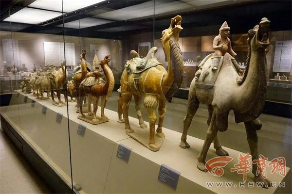 林喆介绍,西市博物馆馆藏展品两万多件,展出的只是其中的1/8。在基本陈列反映西物东渐、东西方文化交流的展区,陈列的一组骆驼俑刻画非常细致。最前面的骆驼俑,驼背上胡人的气质形象非常鲜明。第二件骆驼俑背负的物品,除了水壶和食物,必备的第三样物品就是丝绸。西域出土文献资料中记载有一句话,翻译过来就是:行走在这条路上的商人如果不带丝绸的话,可能连饭都买不上。丝绸在很长时间内,都是世界通认的通货。