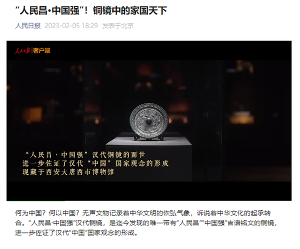 昨日,《人民日报》关注报道大唐西市博物馆馆藏——“人民昌·中国强”汉代铜镜,该镜是迄今发现的唯一带有“人民昌”“中国强”吉语铭文的铜镜,进一步佐证了汉代“中国”国家观念的形成。