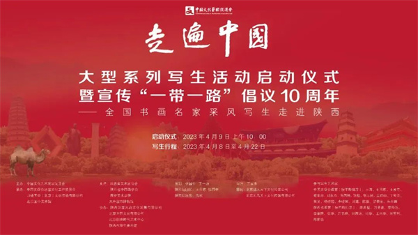 2023年4月9日上午,由中国文化艺术发展促进会主办的《走遍中国》大型系列写生活动启动仪式暨宣传“一带一路”倡议10周年——全国书画名家采风写生走进陕西的活动在隋唐丝路起点西安大唐西市博物馆正式启动。