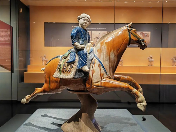 这件文物1966年出土于西安市的一座唐代墓葬中,年轻的骑手双手紧握缰绳,身体微倾坐在马背上。骏马体形彪悍、鬃毛直立,做腾空跃起状。整件文物色彩明艳、造型流畅,是唐三彩中罕见的精品。