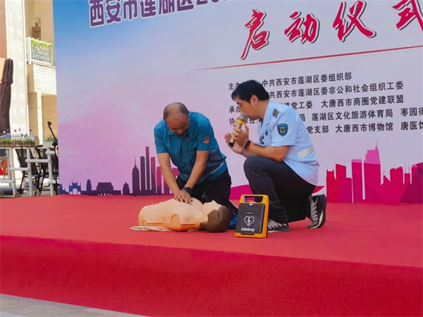 活动中,还为新就业群体代表发放了包含“关爱体检卡”“中医特色理疗卡”“莲湖文旅专项卡”以及防暑降温物品的“关爱大礼包”, 现场为小哥和司机朋友们开展急救实操培训,组织新就业群体集体参观大唐西市博物馆。