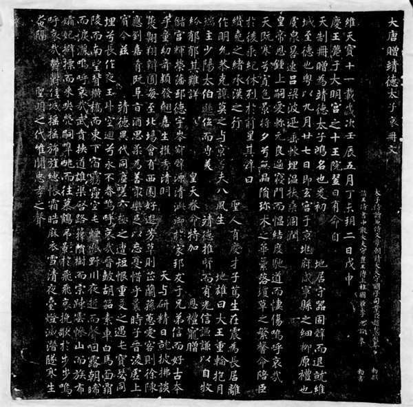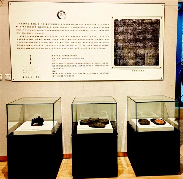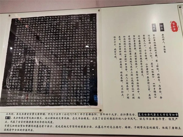 展出的墓志(拓片)有王褒、薛稷、李阳冰等书法家的珍贵书法作品和临兰亭序的著名书手冯承素的墓志;有文史名家徐坚、徐彦伯、吴兢、贺知章、颜真卿等撰写的墓志;有唐高祖贵嫔莫丽芳、唐玄宗长子靖德太子李琮等皇室成员的墓志;有领开隋唐大运河第一段长安至潼关的漕渠的总监郭均的墓志;有杨素兄弟杨岳、孙思邈(药王)儿子孙行、李靖(药师)兄弟李药王的墓志,郭子仪兄弟郭幼儒和郭幼冲等名臣的墓志;有讲“仁以为富,义以为尊”、讲“夫在白屋奉王税,自幼及长,不求减免,谓之志”的唐人品德的墓志;有记载行“焚券免责”西市义商事迹的墓志;有体现民族友好往来的安备墓志、回鹘王子葛啜墓志等。此类墓志(拓片)不仅为研究书法艺术提供了美学价值,也具有极高的文史价值。